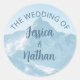 This beautiful mountain wedding sticker features a powerful photograph of snow capped mountains in the winter. Add your names in blue script over the snowy hills. Perfect photography for a cold weather wedding.