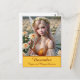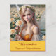 A beautiful golden haired fairy with gold and translucent wings wearing a pretty topaz-coloured dress and topaz jewellery holds a single chrysanthemum while standing in a field of chrysanthemums.