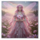 A beautiful fairy wearing a flowing pink dress and a necklace made of opals with opals and cosmos flowers in her long pink hair and light pink dragonfly-like wings holding a pink cosmos flower stands in a magical field of cosmos flowers surrounded by bubbles against an afternoon sky.