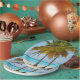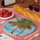 Paper plates with a beautiful and tranquil photograph of 2 palm trees under a bright blue sky.