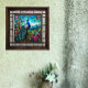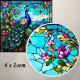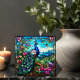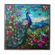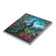 Beautiful Peacock Among Flower Garden features a colourful peacock perched in a tree with it's tail feathers flowing down against a background of rich foliage and hills and flowers blooming done with a stained-glass effect on a ceramic tile. There are many uses for these wonderful ceramic tiles.