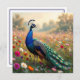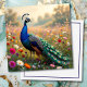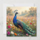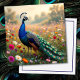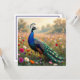 A beautiful illustration of a blue and turquoise peacock in a field of beautiful flowers. Back side of the card is blank so you can write a note.
