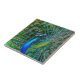 Decorative tile featuring a magnificent peacock with its beak open and tail feathers opened in a wide fan, showing off his exquisite iridescent green, blue and bronze colored feathers. Beautiful home or garden decor for bird and nature lovers. Photograph taken in Arcadia, California.