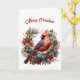 This is an illustration of a vibrant red cardinal perched on a branch. The cardinal is surrounded by festive greenery made of holly leaves, red berries, and pine needles. The artwork captures the bird in beautiful detail, highlighting its striking red feathers and the natural elements around it.
