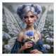 A beautiful blue haired fairy with silvery wings wearing a pretty blue dress and sapphire jewellery holds a single aster while standing in a field of asters.