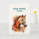Birthday card with a beautiful illustration. A copper brown chestnut coloured horse head and upper body. With watercolor patches behind.