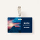 Name tag with with a gorgeous photograph. A scenic spot. A nice calm lake with a wooden dock stretching outwards. Setting sun provides beautiful colours in the sky, vibrant red and blue.