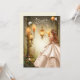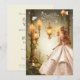 Beautiful Sweet 16 invitation with girl wearing a gorgeous gown standing by pretty glowing garden lamps in a forest. Sweet Sixteen text is done in a lovely silver.