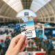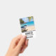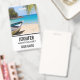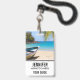 Name badge with an idyllic tropical beach scene. Turquoise blue crystal clear water and a soft brown sandy beach. Some palm leaves hanging down from above. An old wooden rowboat sits on the beach. A serene and peaceful landscape.