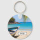 A personalized keychain with an idyllic tropical beach scene. Turquoise blue crystal clear water and a soft brown sandy beach. Some palm leaves hanging down from above. An old wooden rowboat sits on the beach. A serene and peaceful landscape.