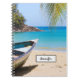 A notebook with an idyllic tropical beach scene. Turquoise blue crystal clear water and a soft brown sandy beach. Some palm leaves hanging down from above. An old wooden rowboat sits on the beach. A serene and peaceful landscape.