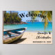 A wedding welcome poster with an idyllic tropical beach scene. Turquoise blue crystal clear water and a soft brown sandy beach. Some palm leaves hanging down from above. An old wooden rowboat sits on the beach. A serene and peaceful landscape.