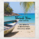 Wedding bottle labels with an idyllic tropical beach scene. Turquoise blue crystal clear water and a soft brown sandy beach. Some palm leaves hanging down from above. An old wooden rowboat sits on the beach. A serene and peaceful landscape.