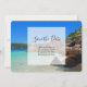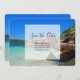 Save the date card with a photograph of a turquoise blue ocean beach with big rocks scattered along the coast. Bright and sunny tropical locale.