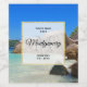 Personalized wine making bottle labels with a photograph of a turquoise blue ocean beach with big rocks scattered along the coast. Bright and sunny tropical locale. A semi-transparent square with a faux gold foil border layered over top with your text inside.
