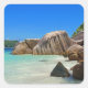 Stickers with a photograph of a turquoise blue ocean beach with big rocks scattered along the coast. Bright and sunny tropical locale.