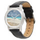 A watch with a beautiful photograph featuring a turquoise blue sea and a sandy beach with waves of foamy surf.