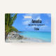 Name badge with a scenic tropical photograph. A secluded beach with white sand and turquoise water.