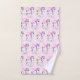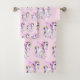 Towel set with an image of a unicorn with big blue eyes, pink wings and a rainbow mane and tail. Kawaii cute.