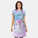 An apron with an image of a unicorn with big blue eyes, pink wings and a rainbow mane and tail. Kawaii cute.