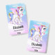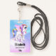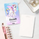 Personalized name badge with an image of a unicorn with big blue eyes, pink wings and a rainbow mane and tail. Kawaii cute.