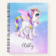 A personalized spiral notebook with an image of a unicorn with big blue eyes, pink wings and a rainbow mane and tail. Kawaii cute.