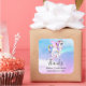 Party favour thank you stickers with an image of a unicorn with big blue eyes, pink wings and a rainbow mane and tail. Kawaii cute.