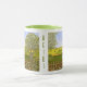 A mug with a beautiful image of a nature scene: A bird sitting on a weathered fence, wildflowers growing around the fence, a farmer on a tractor, working his land, trees with leaves, and farmland with various colours. The background and image can be customized. Text may be added. Original artwork by W.B.