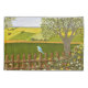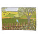 A pillow case with a beautiful image of a nature scene: A bird sitting on a weathered fence, wildflowers growing around the fence, a farmer on a tractor, working his land, trees with leaves, and farmland with various colours. Original artwork by W.B.