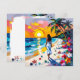 Beachy notecard. A pretty illustration in an oil painting style, made with ai, of a woman walking on a beach through the tropical flowers, palm trees at sunset. A colourful vibrant ai artwork full vibrant colours like blue, yellow, pink, blue and red.