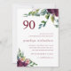 Beautiful and chic watercolor botanical floral and greenery ninetieth birthday celebration party invitation, features a lovely pastel pink back with purple burgundy flowers and greenery, and a white front with elegant 90 typography and blooms with foliage.