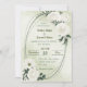 Beautiful botanical wedding invitation featuring romantic white flowers with romantic dark green leaves on a pretty geometric frame.