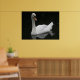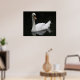 This poster features a photograph of a beautiful white swan. The swan is a male mute swan, you can tell it is male by the black bump on the beak. The swan is gliding gracefully across the water on a calm lake.