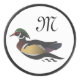 A beautiful wood duck swimming. The illustration is done from the side with a black water wave from the tail feathers.
