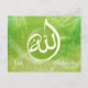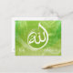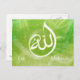 Beautifull Allah calligraphy muslim greeting card special for eid mubarak. serene arabic caligraphy on a green modern nature background combined with beautiful glowing ligth trails and the text eid mubarak.