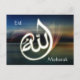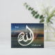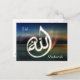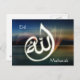 Beautifull Allah calligraphy muslim greeting card special for eid mubarak. serene arabic caligraphy on a green modern nature background combined with beautiful glowing ligth trails and the text eid mubarak.