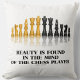 Showcase your existential chess player side with this throw pillow featuring a reflective chess set along with the saying "Beauty Is Found In The Mind Of The Chess Player". Memorable throw pillow for any chess player who likes to think about chess when taking a nap!