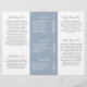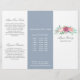 Elegant trifold brochure with a flower garland consisting of pastel pink and mauve roses along with your business name on the front panel. The back panel has your hours of operation and contact information over a dusty blue background. The inner fold panel has two headers and text boxes. The inside has multiple templates for information about your business on the outer panels and a price list in the middle panel. This floral design is great for a hair, nail or beauty salon or any woman owned business.