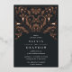 Elegant vintage wedding invitations in rich charcoal off-black feature ornate rose gold foil detailing that evokes the look of cut paper in a papel picado style.