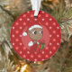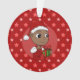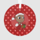 Ornement acrylique avec l'illustration d'un bébé afro-américain souriant mignon tenant un cadeau de Noël et portant un casquette du Père Noël ; dans un cercle rouge sur un arrière - plan rouge avec étoiles, un design de vacances de Noël avec un modèle texte modifiable pour votre nom ou message