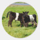 Vache, Sticker, En vedette jouer dans un grand paddock ouvert sont deux vaches Galloway ceinturées de noir et blanc.