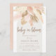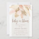 Un bébé en fleur est décoré de feuillage vert pampas. L'invitation peut être neutre du point de vue du genre, tout le texte est modifiable. Ajoutez une touche de couleur dans le texte si vous le souhaitez. Les teintes rousses et terreuses se coordonnent avec de nombreuses teintes. Les teintes terre et muette sont utilisées dans ce design. L'invitation a des accents boho.