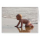 Un joli tableau d'un bébé rampant sur le sable sur la plage, profitant des vagues d'eau qui éclaboussent.