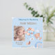 Faire-part de naissance photo bébé garçon en bleu avec adorable ours en peluche et ballons. Cette faire-part de naissance photo adorable douce comprend une photo de votre nouveau-né, texte personnalisé pour le nom qui peut être personnalisé, avec accent arc-en-ciel lunatique et un jeu de couleurs blanc, bleu ciel avec pêche légère/beige. Personnalisez aussi votre nom en bas.