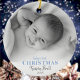 Premier ornement photo en céramique de Noël pour bébé — Personnalisez cette décoration de vacances simple et ronde avec une photo de tout nouveau-né précieux. Le modèle permet également de personnaliser le nom et l'année de naissance. Les deux côtés de l'ornement sont identiques. Chaque modification change l'arrière et l'avant, ensemble.