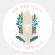 Surf ! Baby shower à thème de surf tropical merci sticker avec une planche de surf à grains de bois naturel et des feuilles tropicaux dans les tons rose et vert.