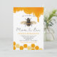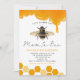 Cute bee theme baby shower invitation card featuring illustration of a bumble bee in the middle with dripping honey on the top and honeycomb pattern. The text says "Let's shower the mom to bee." Gender neutral design.