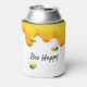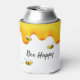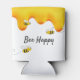 A chic white background. Decorated with cute happy smiling bumble bees and sweet dripping honey. With the text: Bee Happy written with a modern hand lettered style script. Black text. Perfect for summer garden, backyard parties, picnics or warm days on the beach