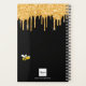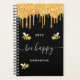 Decorated with happy, smiling yellow and black bumble bees. A chic black background and faux gold glitter drips, paint dripping look. White hand lettered script with swashes and the text: Bee Happy. Personalize and add your name and a year. Perfect for school, work or organizing your personal/family life.