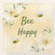 Yellow, white background with a honeycomb pattern. Decorated with light yellow, cream coloured tropical florals flowers, hibiscus and happy bumble bees. The text: Bee Happy. Green hand lettered text. Perfect for your summer home!